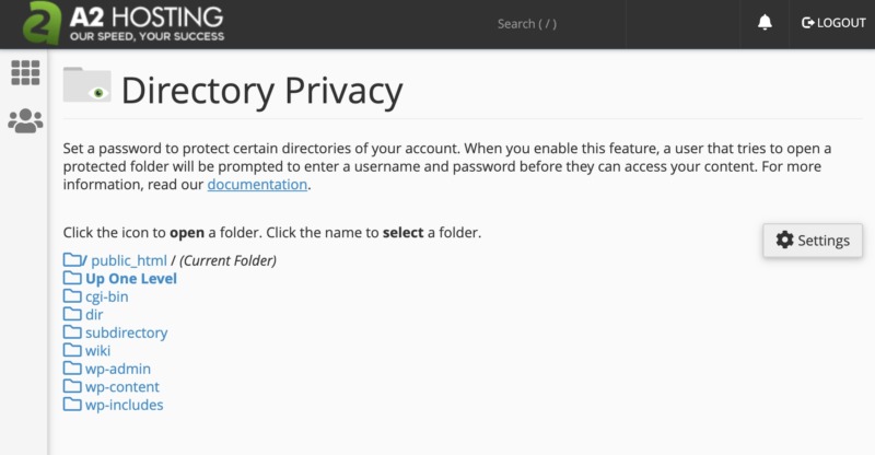 To set up password protection, select Directory Privacy from the main cPanel dashboard. This should launch a new tab where you can explore the WordPress file system.